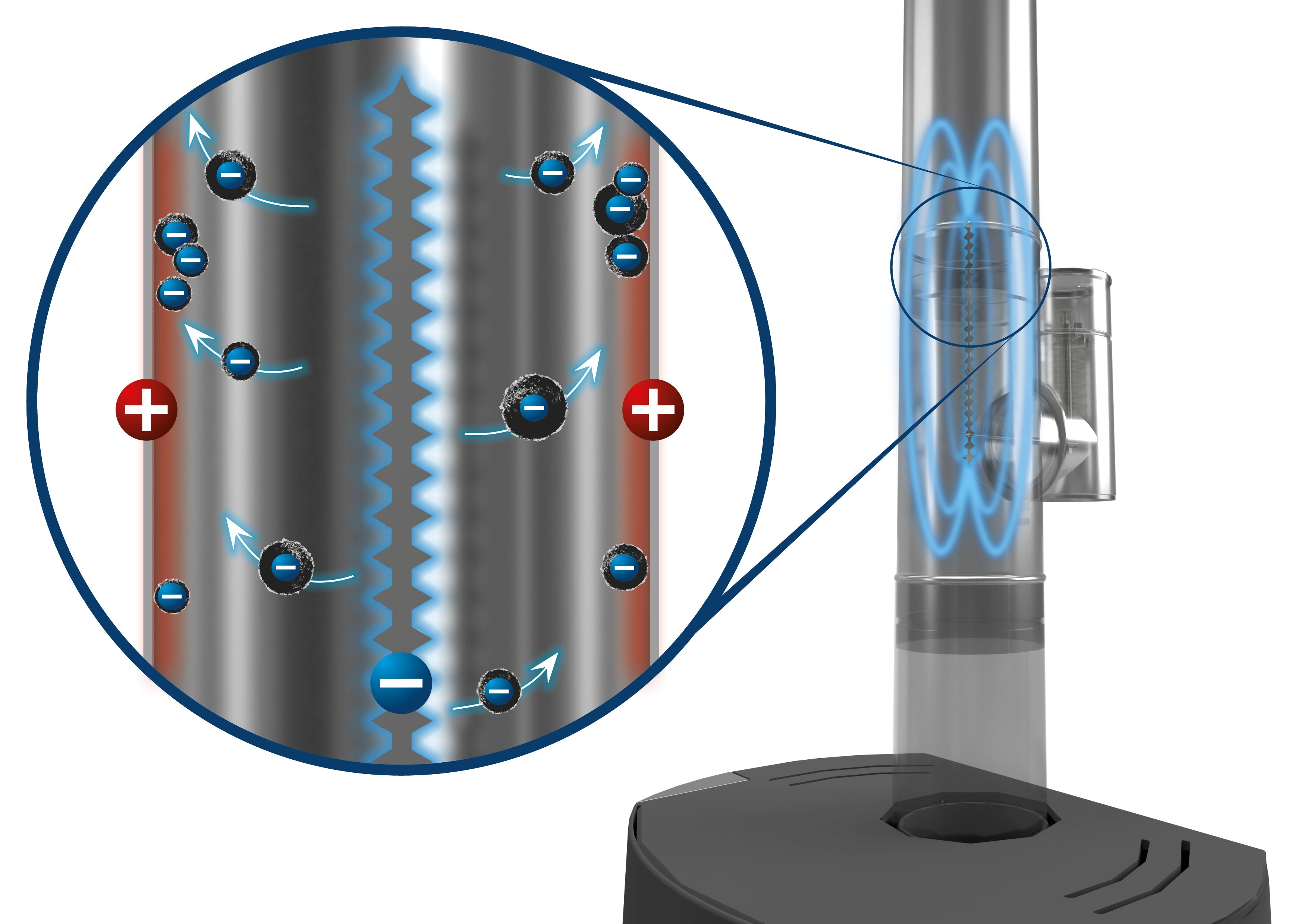 Im Betrieb wird eine feine Elektrode im Abgasstrom elektrisch geladen. Die im Rauch enthaltenen Feinstaubpartikel werden dabei ionisiert und lagern sich an die Innenwände des Abgasrohres oder Schornsteins an.