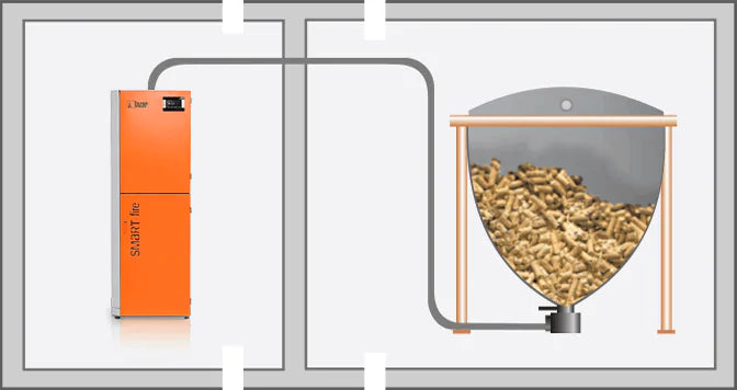 - Flexible Pelletzufuhr: manuell oder mit optionalem Vakuum-/Fördersystem aus dem Lagerraum.