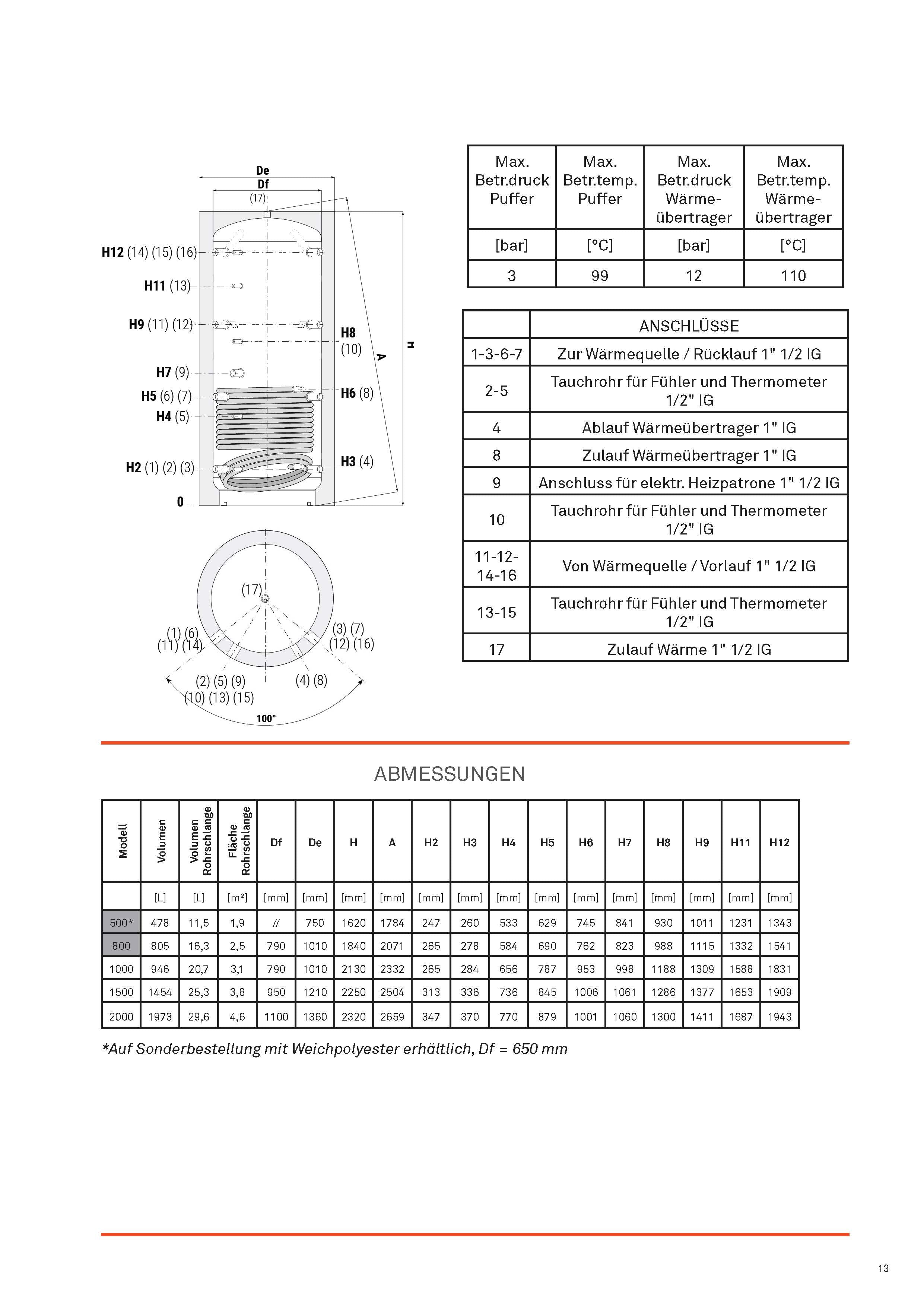 Hygienespeicher 500l, 800l und 1000l mit bis zu 2 Wärmetauscher