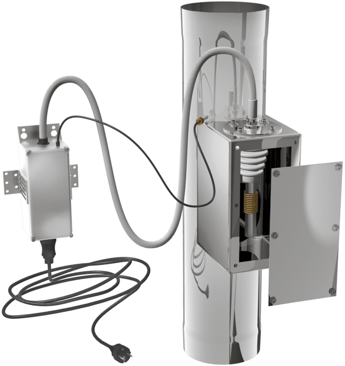 Der Oeko Tube Inside wird als Verbindungselement zwischen dem Kessel und der Abgasanlage montiert. Er wird als fertige Baugruppe geliefert, wodurch das Ausrichten der Elektrode entfällt. Der OekoTube-Inside Standard besteht konstruktiv aus einem Abscheiderohr, einer Isolatorkammer, einem Isolator und einer Elektrode (ohne Reinigungskorb). EMPFEHLUNG: Senkrecht montieren, mit einer Staubsammelschale unterhalb vom OekoTube- Inside Standard.