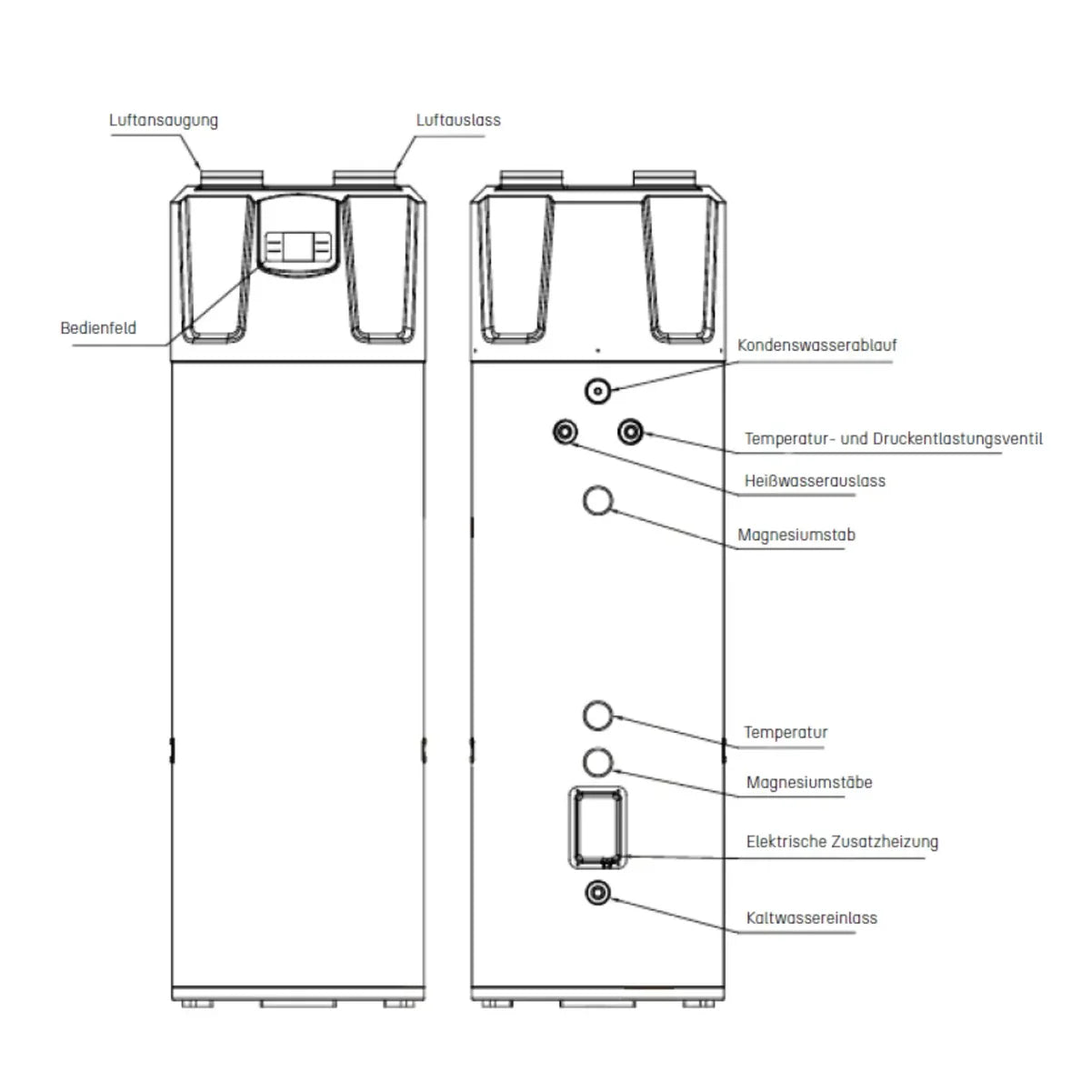 - Zusätzlicher E-Heizstab (2 kW) für schnelle Nachheizung bei hohem Bedarf