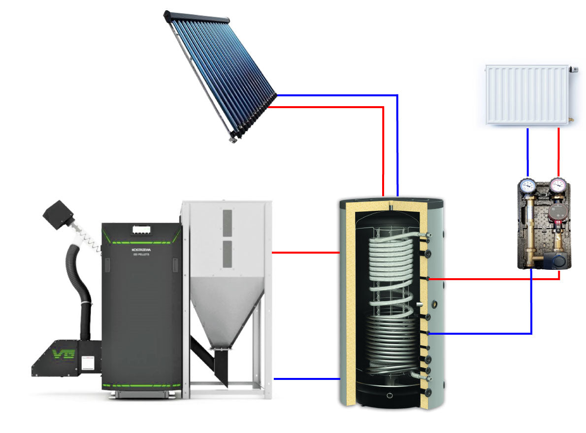 Dieses Pelletheizung Set ist dafür gedacht das Objekt mit Heizung und Warmwasser zu versorgen. Der Hygienespeicher funktioniert wie ein Pufferspeicher, nur hat er noch ein Edelstahlwellrohr eingebaut (wie ein Durchlauferhitzer), das für warmes Trinkwasser sorgt. Somit ist auch das Brauchwasser über die Pelletheizung abgedeckt und das System wird wirtschaftlicher. Die Solaranlage unterstützt den Pellet Kessel zur kalten Jahreszeit und übernimmt im Sommer die Brauchwasser Versorgung. Die hier verwendeten Röhrenkollektoren sind effizienter als Flachkollektoren und lassen sich viel einfacher auf dem Dach installieren.