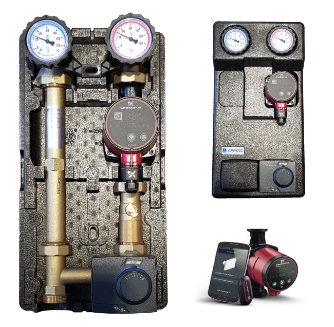 Pumpengruppe Afriso mit Grundfos Alpha 2 - für Hydraulischen Abgleich 3 Wege Mischer und Stellmotor + 2 x Thermometer